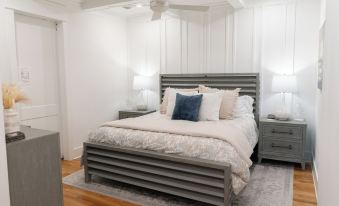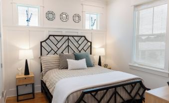 Unwind in our window filled and aesthetically decorated open living space! Curl up on the comfy sofa or armchairs and enjoy the breeze drifting through the screened porch; a perfect spot to go out and relax and enjoy a meal al fresco after a day of soaking up the sun. Catch up on your favorite show on the 55” Frame TV with access to all major streaming services, and keep warm on a chilly day by turning on the cozy fireplace. Gather round to play board games on the coffee table.