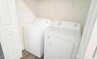 The laundry room has a washer, dryer, ironing board and iron for guest use.
