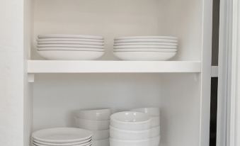 The KITCHEN is fully stocked: knives, a blender, a coffee maker, serving dishes, eating dishes, utensil basically everything you will need to whip up whatever you crave or to serve up delivery pizza.