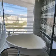 호텔에 도착했을 때, 저는 그 건축학적 디자인에 놀랐습니다! 순백색의 미니멀리스트 로비는 바닥부터 천장까지 180도 투명한 창문과 어우러져, 멀리 보이는 푸른 바다와 하늘이 눈앞에 펼쳐집니다. 컨시어지 이선은 따뜻한 서비스를 제공했습니다. 프런트 데스크 직원은 매우 친절한 미소를 지으며 신속하게 체크인을 진행해 주었습니다. 또한, 친절하게도 여름 더위를 식혀주는 웰컴 드링크도 주셨습니다. 180도의 탁 트인 바다 전망을 감상할 수 있는 팬텀 룸에 머물러보세요. 문을 여는 순간 "와우"라는 외침이 절로 나옵니다! 곡선형 바닥부터 천장까지 이어진 창문 전체가 다둥하이의 탁 트인 바다 전망을 흐르는 그림으로 표현합니다. 침대에서 바다를 바라보고 있으며, 아침에 눈을 뜨면 반짝이는 일출을 보실 수 있습니다. 이 객실은 현대적인 산업 스타일로 디자인되었으며, 주요 색상은 검은색과 회색이고 따뜻한 노란색 조명이 사용되어 고급스러운 느낌을 줍니다. 샤워를 하면서 블라인드 너머로 바다를 바라볼 수 있어 프라이빗하고 낭만적인 시간을 보낼 수 있습니다.