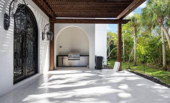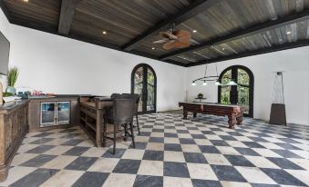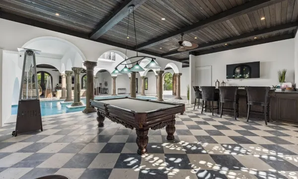 This thoughtfully designed oasis offers something for everyone. Whether members of your group love basking in the Florida sun, while other enjoy relaxing in the shaded comfort of the expansive covered courtyard, this space makes it easy to enjoy vacation your way—while still being together. Open the multiple, big iron and glass doors to let the breeze drift in, or close them for a more private experience. With features like a pool table, dry bar, and outdoor kitchen, the poolside courtyard is perfect for both connection and relaxation. Indoor luxury and outdoor beauty come together in perfect harmony.