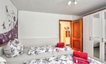 Cosy, historical 3-family house from the 17th century. In the centre of Schwalenberg, traffic calmed area, 300 m from the edge of the forest, 7 km from the lake, 20 m from the stream. In the house: storage room for bicycles, central heating system. Public parking on the road. Shop 6 km, grocery 400 m, supermarket 6 km, restaurant 20 m, bakery, café 100 m, bus stop 400 m, railway station "Schieder" 7 km, outdoor swimming pool 6 km. Walking paths from the house 200 m. Nearby attractions: Externsteine 25 km, Hermannsdenkmal 26 km, Welterbe Corvey 28 km. Well-known lakes can easily be reached: SchiederSee (Stausee) 7 km. Please note: car recommended. "Born 1", 3-room apartment 110 m2, on the ground floor. Tasteful furnishings: living room 19 m2 with satellite TV (flat screen). Exit to the terrace. 1 room 16 m2 with 1 double bed (180 cm, length 200 cm). 1 room 12 m2 with 2 beds (90 cm, length 200 cm). Kitchen 15 m2 (oven, dishwasher, 4 ceramic glass hob hotplates, microwave, electric coffee machine) with dining table. Bath/WC, shower, sep. WC, Sauna. Small terrace 6 m2. Terrace furniture. Facilities: hair dryer. Internet (WiFi, free). Blu-ray player. Please note: fridge without freezer, non-smokers only. Maximum 2 pets/ dogs allowed. Smoke alarm. The sauna is an infrared heating cabin.