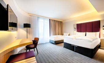 The hotel is conveniently located close to the city center. Everything is clean, comfortable, and in good repair. The breakfast is nice; nothing special, but it does the trick. The whole hotel looks and feels a little like a Motel One. One side of the hotel faces a pedestrian square ("Platz am Bollwerksturm") and is probably quiet at night. The other side unfortunately faces a very busy multilane street ("Bundesstrasse 39") with an intersection, and if you like to sleep with your window open, that can be a problem. Granted, the night I was there, seems like some drivers were playing Fast and Furious, doing some street racing.