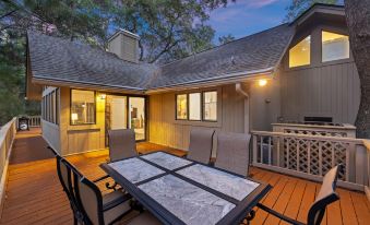 The open-floor plan of the main living space and kitchen is perfect for entertaining and spending time with friends and family. There is a gorgeous sun room with expansive windows that allows guests to take in the wooded views and helps to fill the home with natural light. It is a wonderful spot for playing board games or relaxing with a book. You'll also love relaxing on the comfortable sectional sofa in front of the large TV. There is a beautiful dining table with seating for eight as well as a few more bar stools at the kitchen counter. The newly upgraded kitchen has plenty of storage and prep space.