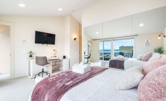 A spacious and cozy retreat with a queen-size bed in soft tones. This room includes a mounted TV, a portable A/C unit, and a dedicated workspace with an ergonomic chair, perfect for remote work.