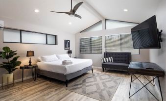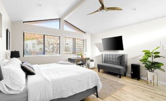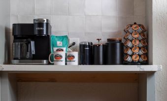 For those seeking added privacy, the Casita offers a secluded sanctuary. This detached suite features a king bed, breathtaking mountain views, and a Smart TV. A dedicated workspace makes it ideal for remote work, while a kitchenette with a fridge, microwave, and French press ensures ultimate convenience. The Casita also includes its own full bathroom with a walk-in shower, giving guests a hotel-like experience within the comfort of a home.