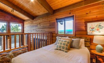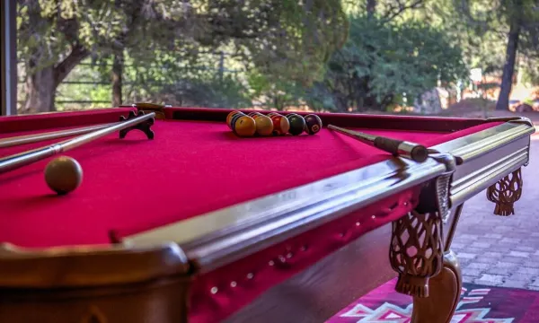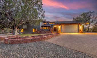 This is a beautiful cabin-style single-family home located in West Sedona, situated on 2.5 acres, in a quiet neighborhood. The house has 4 bedrooms, 3 full bathrooms, a game room with a bed(bedroom 5) and arcade machine, 2 living rooms, a den, 2 fireplaces, a year round HEATED pool, hot tub, fire pit, & BBQ. Great for multiple families. The backyard patio has lovely views of the sunset and red rock mountains, with plenty of seating. This is our family home located in a peaceful neighborhood, and we do not allow parties of any kind. About pets:No pets allowed.About checkOut:Check out before 10:00 AM.About children:Children allowed: ages 0-17.About customRules:Extreme fire hazard for our area: please no smoking on our property or anywhere near it..No pool floaties allowed on lawn, nor any water bottles allowed to lie around on lawn. (This can start a fire by the sun shining through it.),No ATV's or Drones allowed.About checkIn:Check in after 4:00 PM.About smoking:Smoking is not permitted.About minBookingAge:Minimum age to rent: 25.About events:No events allowed.
