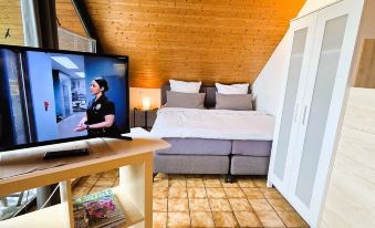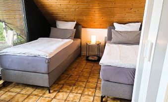 The apartment is modern equipped with 2 single beds (90 x 200), bedside table, wardrobe, table and leather chairs, couch, and a TV.