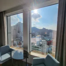 블로거 추천을 보고 예약해봤는데, 생각보다는 괜찮았어요. 아래층에 먹거리, 마실 거리가 많아 편리했고, 신세계 백화점도 가까웠어요. 침대도 편안했습니다. 다만, 샤워를 욕조 안에서 해야 한다는 점은 이해가 안 되더라고요. 차라리 욕조가 없었으면 더 좋았을 것 같아요. 냉장고는 텅 비어 물 한 병도 없었고, 세면대에도 아무것도 비치되어 있지 않았어요. 심지어 욕조에는 긴 머리카락 두 가닥이 있었고, 창문도 없었네요. 무엇보다 체크아웃이 11시라니, 호텔에서 늦잠도 못 자게 하는 건 좀 아쉽네요.