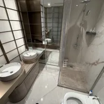 한 가지 주의할 점은 욕실 세면대가 조금 작고 불편해서 주방 세면대에서 씻는 것이 좋다는 것입니다. 샤워실의 온수기는 사용하기가 조금 까다로워서 켤 때마다 모드를 바꿔야 했습니다. 하지만 수압은 훌륭했고, 수온은 강하고 적당했습니다. 샤워젤과 샴푸도 제공되어 좋았습니다.