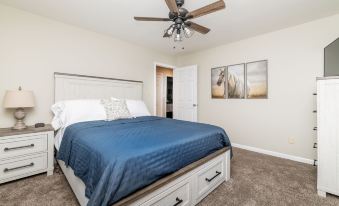 And last but not least, feel like a king or queen in the memory foam king bed in the Kentucky Derby-themed Primary suite which comes with its own steps and en-suite bath with tiled shower, large walk-in closet, 55” flat screen smart tv, plenty of storage in the dresser and more room in the matching nightstands.