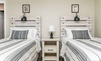 Down the hallway, you’ll find a laundry closet with washer and dryer and a closet with iron and ironing board. The first bedroom has a queen memory foam bed, nightstand, large closet, dresser, and 40” flat screen smart tv. The second bedroom has 2 matching memory foam twin beds with attached reading lamps, a 40” flat screen smart tv, a tall dresser with PlayStation 3 for those wanting to play video games and and a desk for those needing a space to do some work. Across the hall, you’ll find a bathroom with shower/tub combo and linen closet stocked with plenty of towels.