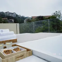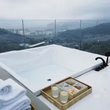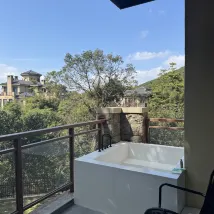 객실은 비교적 현대적인 디자인으로 되어 있으며, 객실에 들어오자마자 은은한 향기가 나고, 가벼운 음악도 함께 있어 매우 편안합니다. 객실은 산의 경치를 바라보고 있으며, 욕조는 일회용 비닐봉지로 세심하게 덮여 있어 매우 위생적입니다.