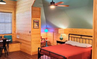 This house was built in 1915 by John and Hulda Keil at 512 S. Mill Street, Flatonia, Texas. In March 2024, the house was purchased and moved in June 2024 to its current location at 304 N Avenue B in Shiner, Texas to begin its new life as part of the Old Kasper House Victorian Inn. The first floor has a colorful 50s, 60s and 70s Bohemian vibe with period furniture and some interesting original artwork. The industrial kitchen provides an oven, microwave, dishwasher, refrigerator/freezer, cookware and dishes. The living room has a dining table, TV, and a seating area. Downstairs there are two private bedrooms, one with a King size bed and the other with a Queen size bed, that share a full bathroom with a shower. The Living Room and King Bedroom have exterior doors to the north facing covered front porch with a view of the K. Spoetzl Brewery & Distillery located 3 blocks away. At the rear of the house is a deck with chairs perfect for enjoying morning coffee and kolaches from a local bakery or an adult beverage in the evening while star gazing. The finished attic has a completely different feeling, that of a bright and airy bunkhouse with three semi-private sleeping alcoves. Each alcove has a queen size bed, an open closet, and seating area. There are three gabled areas with bench seating with a table and chair perfect for working or checking emails. The attic has a shared full bathroom with a shower. The house is equipped with central air conditioning and heat. The floor, walls, and attic roof are fully insulated to keep out the Texas Heat (and the Texas Cold). Wi-Fi and off-street guest parking is provided.About pets:No pets allowed.About children:Children allowed: ages 0-17.About smoking:Smoking is not permitted.About events:No events allowed.