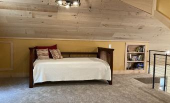 This new construction cabin sits on a 2 acre wooded site. It has a spacious bedroom with a queen size bed, full bath and open living space design. The roomy living area has a queen sized sleeper sofa. The kitchen includes a stove, refrigerator, keurig and a fabulous built-in bench style table. The open loft has a twin sized day bed and adorable padded window bench. Linens are provided but no linen service during your stay. Wifi, Dish network and a dvd/blu-ray are available.