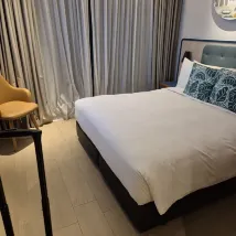 저희는 아파트가 아닌 호텔 방에 묵었습니다. 방은 꽤 작았습니다. 샤워 부스, 미니 냉장고, TV, 다리미판, 헤어드라이어, 전기 주전자가 있었습니다. 수영장, 피트니스 센터, 세탁실, 간이 주방, 그리고 로비층에는 공부/업무/휴식 공간이 있었습니다. 지하철역은 도보로 10~15분 거리에 있었습니다. 보트 키, 클라크 키, 호커 센터, 그리고 여러 펍, 식당, 편의점까지 걸어서 갈 수 있는 거리였습니다. 하지만 주말과 공휴일에는 근처 레스토랑, 카페, 상점들이 모두 문을 닫습니다. 저희는 반려동물 동반이 가능해서 묵었습니다. 방은 그다지 깨끗하지 않았습니다. 바닥은 축축하고 끈적거렸고, 이불 커버에는 얼룩이 있었습니다. 그리고 문을 닫거나 청소하는 소리처럼 쿵쾅거리는 소리가 너무 커서 강아지가 매우 예민하게 반응했습니다. 기본적인 세면도구와 목욕 타월은 제공되었지만 생수는 없었습니다. 엘리베이터 근처에 정수기가 있었습니다. 전반적으로는 괜찮지만, 훌륭하지는 않습니다. BQ와 CQ까지 걸어가는 것은 좋지만 우산을 꼭 챙겨오세요.