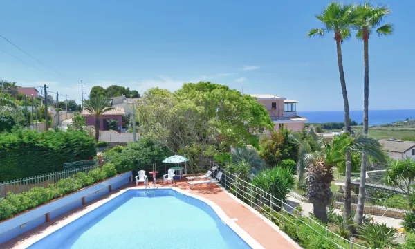 Large villa "Vella", surrounded by meadows. In the resort Terrauzza, 10 km from the centre of Siracusa, in a quiet, sunny position, 700 m from the sea, 700 m from the beach. Private: property 3'000 m2 (fenced), large, well-kept garden 2'100 m2 with lawn and trees, swimming pool (80 m2, depth 120 - 150 cm, seasonal availability: 01.Apr. - 31.Oct.). Outdoor shower, barbecue. In the house: fitness room. Parking. Bus stop 200 m, railway station "Siracusa" 9 km, sandy beach "Arenella" 5.5 km, rocky beach "Terrauzza" 700 m. Nearby attractions: Avola 23 km, Noto 32 km, Marzamemi 50 km, Ispica 53 km, Isola delle Correnti Punto Sud Sicilia 58 km, Modica 68 km. Well-known ski regions can easily be reached: Punto Partenze Sud Escursione Etna 105 m. Well-known lakes can easily be reached: Riserva Naturale Laghetti del Cassibile 34 km. Hiking paths: Riserva Naturale Faunistica di Vendicari 40 km. Please note: car recommended. The owner lives in the same residence. 7-room villa 220 m2 on 2 levels, on the ground floor. Comfortable and stylish furnishings: entrance hall. Large living/dining room with open-hearth fireplace, TV, air conditioning and forced-air heating. Exit to the terrace. Office with air conditioning and forced-air heating. 1 double bedroom with 1 double bed (140 cm), air conditioning and forced-air heating. Large kitchen (mini-oven, oven, dishwasher, Gas stove, 4 gas rings, toaster, microwave) with dining table, Scandinavian wood stove. Exit to the garden. Shower/bidet/WC. Upper floor: 1 double bedroom with shower/bidet/WC, air conditioning and forced-air heating. Exit to the terrace. 1 double bedroom with 1 double bed (140 cm), shower/bidet/WC, air conditioning and forced-air heating. Exit to the terrace. 1 double bedroom with bath/shower/bidet/WC, air conditioning and forced-air heating. Exit to the terrace. Parquet floors. Small terrace 6 m2, small terrace 8 m2, porch 16 m2. Terrace furniture, balcony furniture, barbecue, deck chairs, conservatory. Beautiful view of the sea, the lake, the swimming pool and the garden. Facilities: washing machine, iron, children's high chair, baby cot for up to 2 year olds, hair dryer, logs (extra). Internet (WiFi, free). Parking (3 cars). Please note: smoke alarm, fire extinguisher. No internal connecting door between the separated properties. The pool mentioned in the description is for private use. IT089017C2W5ZGNSL3