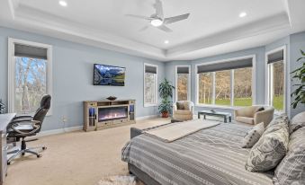 Bedrooms include a first-floor master that expands the entire north wing of the home, with stunning views of the property, and an extra large bathroom with jetted tub, shower and steam sauna. A large bedroom is privately located on the 2nd floor with ensuite bathroom and high views of the neighboring farm, which sleeps 4+ and is ideal for kids or extra guest space. Two other bedrooms on the main floor each have queen beds with a jack & jill bathroom. Each bedroom includes a large TV with Wi-Fi and access to streaming services.