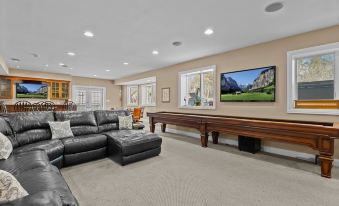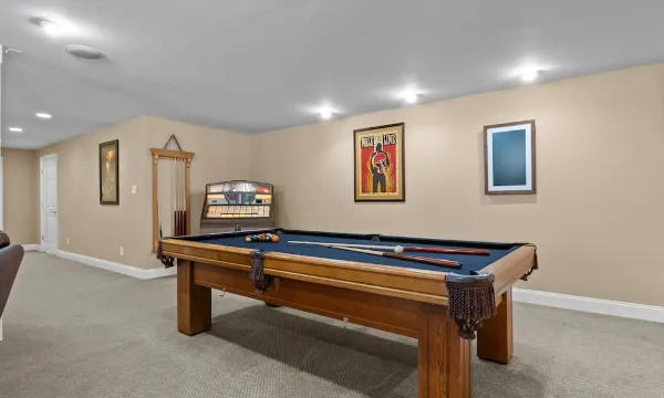 The extra large basement includes a "retro-style" juke box equipped with 250+ classic vinyl records, board games, two 3-D TVs, shuffleboard, kids toys, dart board, full kitchen & bar, pool table, fitness room, built-in karaoke system and 6-seat (newly-added) movie theater! Outside the basement is an expansive, completely private patio with lounge chairs, fire pit, oversized hot tub, outdoor music system, and multiple dining and seating areas for entertaining.
