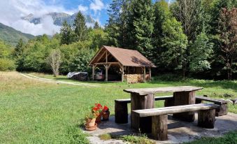 The apartmant has a bedroom , kitchen, dinning room, bathroom. The uper place in the house is not in use, so you are alone and have all privacy. All around the house is a beautifull meadow, a forest 1oo m away and a emerald river Soča 2oo m away. A nearby shop is about 4oom away There is also a bar with wifi. A distances to Bovec is 15 km.