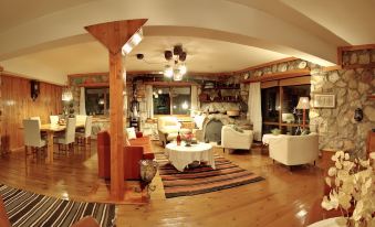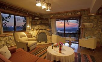 Villa Saranda – the name is taken from the old Greek name for this area – is rustic, it’s a mountain lodge – alpine chalet style – rough stone walls and warm pine are complemented with comfortable furnishings, antique collections and quirky pieces. Climb the steps to the upper floor and you’ll notice they accommodate the huge rock that has stood in the same place for many millions of years.