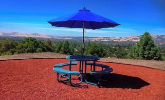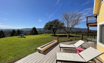 We are refreshed after our second vacation in this child's paradise located on a hilltop with fantastic Sonoma hillside views. Wonderful, well equipped and spotless accommodations greeted our multi-generational family party of six, that included two young children ages three and six. Not only were the toys, games and puzzles adorning the children's bedroom a delight, but the elaborate outdoor climbing structure and trampoline were major hits. Adding to the daily excitement were the sightings of deer hanging out by the house with a young fawn. We loved the expansive grounds with sparkling lights and sea creatures hanging in trees. What a magical setting we woke up to after a deep night of sleep in an incredibly comfortable bed. We love the walkability of the location, following tree shaded lanes through a charming neighborhood to restaurants, produce and grocery venues, and more. We highly recommend this property for families with young children. The owners were delightful and very responsive to any requests. Looking forward to a return visit someday!