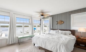 This home has 5 beds. A king on the main floor master with amazing views of Lake Charlevoix and a full bathroom , a Loft with a queen and a full bed on the top level with full private bath, and then lower level walk out to your private dock also has a queen and full bed sleeping 10 comfortably