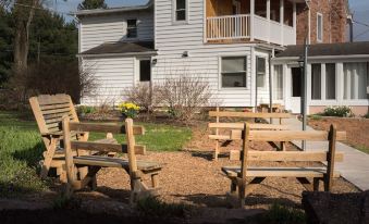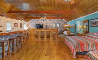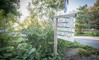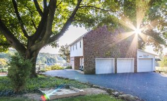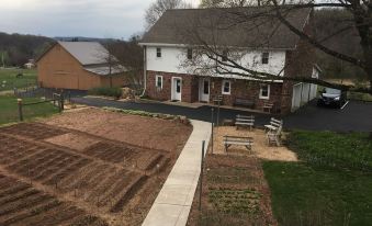 This gorgeous 1,100 sq ft contemporary space boasts hardwood floors, 20 ft high wooden ceilings and beams, and an interior flagstone wall. A true mountain lodge feeling!! Includes gas fireplace; granite counter tops and glass doors in the kitchen area; flagstone floor and cedar closet in the bathroom! For sleeping there are two queen sized beds, a set of handmade wooden bunk beds, and a large overstuffed sofa. Above the garage in the carriage house; it was built using sandstone from the original bank barn. Located on a 6.5 acre working farm with goats, chickens, and a donkey - beautiful scenery, vegetable and flower gardens in season! And of course central air for those warm days! Guests can participate around the farm if they wish. And campfires are available weather permitting. The hosts, Richard and Nancy, offer classes in pie-making, cheese-making, native wild flowers, gardening for children, among others. Other amenities include: TV with amazon prime, netflix, and hulu; wifi; and farm to table breakfasts can be arranged.About pets:No pets allowed.About children:Children allowed: ages 0-17.About customRules:Recycling and food composting is mandatory!.Shoes off inside the door! No shoes worn in the apartment!,Guests interested in interacting with the farm animals MUST be supervised! Long pants - preferably jeans and close-toed shoes required. No jewelry!.About smoking:Smoking is not permitted.About events:No events allowed.