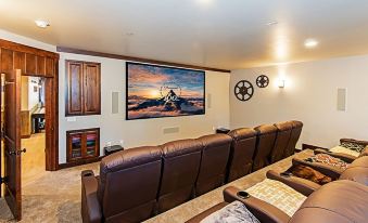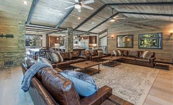Enormous main living room and open kitchen, with 4 comfy leather couches, huge rock wall Fireplace, 80 inch Flat Screen..