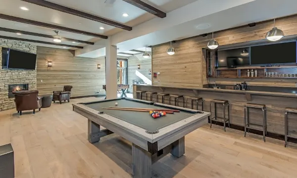 Large game room with Pool table, Foosball, bar with multiple TVs for viewing multiple games.. Rock fireplace with 70' Flat Screen set above..