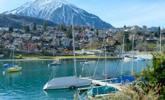 40 m2. More information by the provider: Situated in the heart of the most beautiful bay in Europe, the 2.5-room flat enchants with its breathtaking view of Lake Thun and the local mountain Niesen. Bedroom (double bed), kitchen-living room, bathroom (shower/WC) and balcony. Spiez Castle, cultural landmark of the region, towers behind the bedroom. The balcony and the nearby outdoor swimming pool (during summer) invite you to sunbathe.