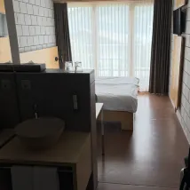 시설: 대부분 콘크리트 스타일인데, 스타일은 개인의 취향에 따라 다릅니다. 욕실에 문이 없어서 잘 이해가 안 됩니다. 주전자도 없어서 라면을 끓이는 데 매우 불편했습니다! 밤에는 커피 머신의 뜨거운 물을 써야 했는데, 4.20 스위스 프랑이었는데 3분의 1만 채웠습니다! 정말 바가지였습니다! 또한, 발코니에는 칸막이가 없어서 같은 층에 있는 모든 사람이 함께 쓰기 때문에 프라이버시가 거의 없습니다.