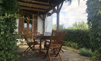 The cottage has a private garden and a terrace with wooden furniture. There is a parking area just in front of the cottage