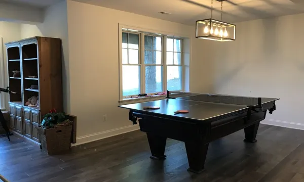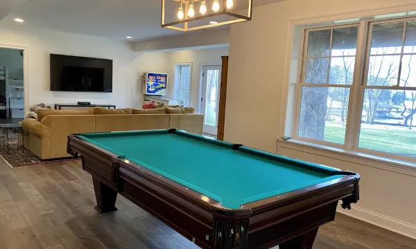 This lake home is on 9 acres of land, with a walk-in sandy beach on Lake Anna. It is in a large, quiet no-wake zone with long views and that is great for swimming, paddleboarding, floating or just relaxing. The property is located on the public side of Lake Anna, which means you can access restaurants, tiki bars, mini-golf, marinas and more by boat. Plus, the water doesn't get too warm in the summer on the public side, as can happen on the private side. There is lots of wildlife, including deer, foxes and bald eagles. You can swim, boat, tube, jetski, canoe and play in the lake. There's a marina down the street that rents pontoon boats and personal watercraft by the day. The home has 6 bedrooms and three large common areas, including a tricked out basement with pool table, 80" hi-def TV, a pinball machine and beautiful views of the lake. The main floor is open with a large, stone fireplace in the living room, a large screened-in porch, and a sun deck overlooking the lake. There is also a bonus loft family room with vaulted ceilings and a wall of windows overlooking the lake. There is a gas grill on the sun deck and an outdoor shower with hot and cold water.About pets:Pets allowed: dogs and cats less than 50 lbs per pet (limit 2 pets total).About checkOut:Check out before 11:00 AM.About children:Children allowed: ages 0-17.About checkIn:Check in after 4:00 PM.About smoking:Smoking is not permitted.About minBookingAge:Minimum age to rent: 25.About events:No events allowed.