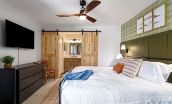 The primary bedroom is a serene retreat with a king-size bed and an attached bathroom for privacy and comfort. The secondary bedroom is ideal for families or groups, offering a queen bed and a bunk bed with a twin on top and a full on the bottom, along with its own attached bathroom.