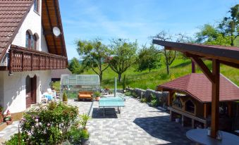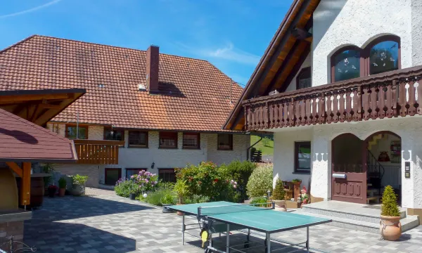Apartment house "Pension Himmelsbach". In the district of Welschensteinach, on the outskirts, 4 km from the centre of Steinach, in a quiet, sunny, elevated position on a slope, in the countryside. For shared use: property, lawn for sunbathing, swimming pool (10 x 5 m, seasonal availability: 01.Jun. - 30.Sep.). Slide, table tennis, barbecue, children's playground. In the complex: lounge, billiard table, central heating system, washing machine (extra), tumble dryer (for shared use, extra). Stepped path (17 steps) to the house. Parking at the house. Shop 1 km, grocery 4 km, restaurant 1 km, bus stop 100 m, railway station "Steinach" 4 km, outdoor swimming pool 4 km, indoor swimming pool 4 km. Golf course (18 hole) 8 km, tennis 4 km, riding stable 1 km. Nearby attractions: Zeller Keramik 5 km, Altstadt Haslach 8 km, Freilichtmuseum Vogtsbauernhöfe 8 km. Well-known lakes can easily be reached: Mummelsee 35 km. Hiking paths: Kinzigtal 2 km. Use of the shared whirlpool on request. In the adjacent courtyard building, the house owner still runs a small part-time farm with goats. 2-room apartment 35 m2, on the ground floor. Fully renovated in 2020, beautiful and modern furnishings: living/dining room with satellite TV (flat screen). 1 double bedroom. Kitchenette (oven, 4 ceramic glass hob hotplates, electric coffee machine). Shower/WC. Patio. Please note: non-smokers only.