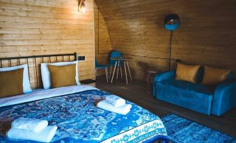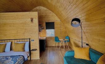 In the glamping you will find 1 large double bed. 1 pull-out 2-seater sofa, free WiFi, central heating and hot water. Kitchen with dining area. Dishes, refrigerator, water depending on the number of guests. Necessary number of towels, bathrobes, toothbrushes, soap, shampoo, shower gel, best quality plumbing.