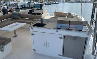 The flybridge deck and helm station with an outdoor kitchen equipt with a sink, fridge and BBQ grill is perfect for those sunset cocktails while you watch the sun dip below the horizon,