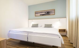 By the sea, at the foot of National Park Strunjan Salt panes. Beautiful resort "Salinera". From the sea, 300 m from the beach, in the countryside. For shared use: park 1'000 m2 (fenced), swimming pool, indoor pool (seasonal availability: 15.Jun. - 30.Jun. and 01.Aug. - 15.Sep.). Outdoor shower, tennis (16.Apr. - 30.Sep.) (extra), children's playground. In the house: reception, sauna (extra). Washing machine, tumble dryer (extra). Parking. Grocery 1.1 km, restaurant 200 m, bus stop 1 km, pebble beach, shingle beach, rocky beach 300 m, outdoor swimming pool, indoor swimming pool 200 m. Tennis 3.6 km. "Salinera A4+1", 3-room apartment 42 m2. Comfortable and tasteful furnishings: living/sleeping room with 1 sofabed, flat screen and air conditioning. Exit to the terrace. 1 room with 1 double bed (160 cm, length 200 cm). 1 room with 2 beds (90 cm, length 200 cm). Kitchenette (2 hot plates, dishwasher, microwave) with dining nook. Shower/WC. Heating, electric heating. Terrace 5 m2. View of the countryside. Facilities: Internet (WiFi). Parking at the house. 1 small pet/ dog allowed.