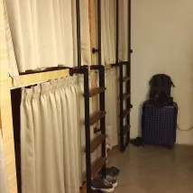 저희 2인실이 최고예요. 배낭여행 스타일에 딱 맞았어요. 벤치, 창가에 누울 수 있는 공간, 냉장고, TV, 그리고 무엇보다 비데가 있는 화장실까지!❤️❤️❤️❤️❤️