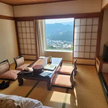 하지만 정말 싫었던 점은 문 잠금장치가 너무 열기 힘들었다는 거예요. 아마 이 문만 그랬을 수도 있겠죠. 산 경치는 정말 아름다웠고😊 휴가를 보내기 좋았습니다. 싫었던 점은 오래된 온천 호텔 이불 밑에 시트가 깔려 있어서 밤에 잘 때 몸에 자꾸 감겨서 너무 불편했어요.