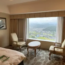 방은 넓었고, 다카야마 시내 전체가 내려다보이는 멋진 전망을 가지고 있었습니다. 3일 동안 이 호텔에 묵었는데 정말 편안하고 좋았습니다.