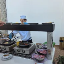 Petit déjeuner buffet à volonté très varié, (exemple : possibilité de choisir les ingrédients pour omelette, spécialités culinaires marocaines etc.)