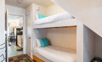 When you step into this third floor condo, you're in an entry room with many functions. There is a loveseat with pull-out twin bed, a wall-mounted flat-screen and built-in twin bunk bed. To the right, the stairs go to the bedrooms. Ahead and off to the left in a recess is the stack washer/dryer, and a small vanity area. The door for the bathroom with shower-tub combo and toilet is next to the vanity.