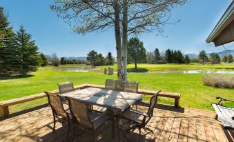 Overlooking the Jackson Hole Golf & Tennis Club, this gorgeous Jackson home is just what you've been hoping to find for your next Wyoming vacation! You'll love waking up with your first cup of coffee as you soak in the sunshine and the golf course views from the comfort of the private deck. Inside, the townhome enjoys a stylish modern ambiance with vaulted ceilings and lots of natural light. Let the gas fireplace warm everyone up after a day on the slopes. The full kitchen features attractive wood cabinetry and everything you need, from cookware to counter space, to prepare a home-cooked meal. Serve it up on the dining table, then stretch out on a comfortable sofa to watch a good movie on the TV.