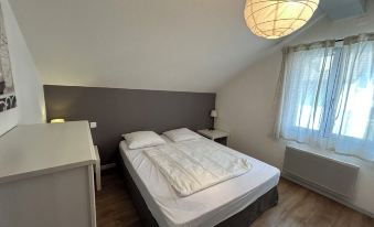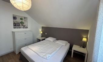 Apartment located in one floor, living room with kitchenette (oven, microwave, dishwasher, fridge freezer, table and chairs, sofa bed, TV, internet bathroom with bath with a shower screen and washing - machine. Upstairs bedroom with a double bed, wardrobe and chest of drawers + in the release of a single bed downstairs. séparé.Parking private toilet in the yard.