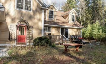 Let the chef of the group prepare a nice home cooked meal with a fully functioning kitchen with all the pots, pans and utensils provided for you. Kitchen is on the first floor along with a bedroom with a queen bed. The upstairs space has six twin beds and a full bath in the loft. Next is a large common space including a sitting area with lots of board games, and a living area with a large smart TV. Two additional bedrooms are through the loft with a queen bed in each. Two more bedrooms with queen beds located in the newly finished Basement . Finally, hike through the back of the property to the Mad River (adventures types only please).About pets:No pets allowed.About checkOut:Check out before 11:00 AM.About children:Children allowed: ages 0-17.About checkIn:Check in after 4:00 PM.About smoking:Smoking is not permitted.About minBookingAge:Minimum age to rent: 21.About events:Events allowed: family gatherings, birthday parties, weddings.Maximum event attendees: 16.