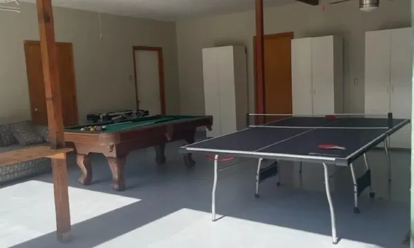 The garage is made into a game room equipped with pool table, ping pong table, air hockey, and dart board (to come). We provide board games for you to enjoy with your family.