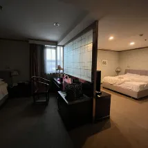 예약할 때 고층 객실을 요청했는데 맨 아래층 5층에 이런 객실을 배정받았습니다. 창밖 전망은 없었고, 다른 건물의 유리창만 감상할 수 있었습니다.