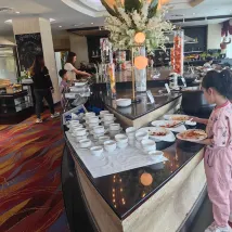 조식 뷔페는 꽤 푸짐한 편인데, 연휴 기간에는 사람이 많아서 자리 찾는 데 시간이 오래 걸렸어요. 게다가 아침 식사에는 너무 뜨거운 것이 없습니다. 죽, 우유, 두유는 "따뜻하다"는 "뜨거운" 기준에 맞지 않습니다.
